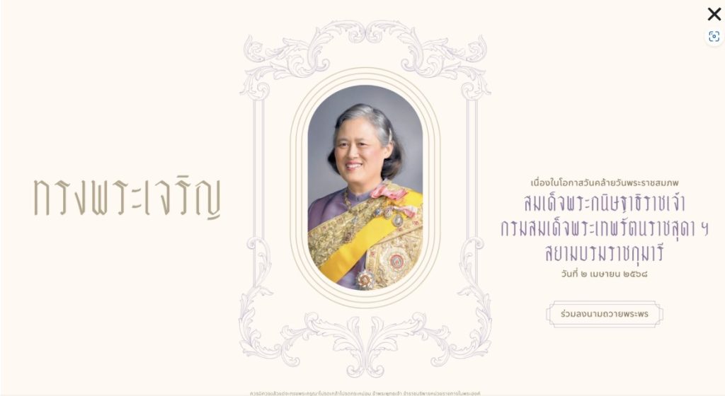 สำนักพระราชวัง ขอเชิญชวนประชาชนร่วมลงนามถวายพระพร สมเด็จพระกนิษฐาธิราชเจ้า กรมสมเด็จพระเทพรัตนราชสุดา เจ้าฟ้ามหาจักรีสิรินธร มหาวชิราลงกรณวรราชภักดี สิริกิจการิณีพีรยพัฒน รัฐสีมาคุณากรปิยชาติ สยามบรมราชกุมารี เนื่องในโอกาสวันคล้ายวันพระราชสมภพ วันที่ ๒ เมษายน ๒๕๖๘ ผ่านระบบออนไลน์ ที่เว็บไซต์หน่วยราชการในพระองค์ www.royaloffice.th ระหว่างวันที่ ๑ – ๓ เมษายน ๒๕๖๘