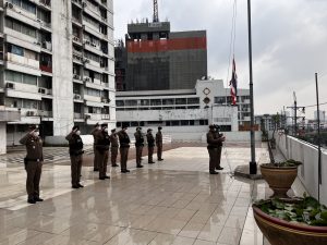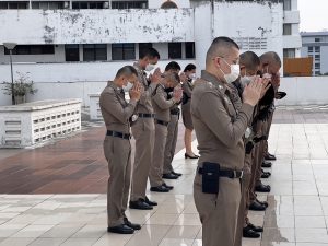พร้อมข้าราชการตำรวจ เข้าแถวเคารพธงชาติ สวดมนต์ไหว้พระกล่าวอุดมคติตํารวจ , ราชสวัสดิ์ , สิบโม้ , สะเจ