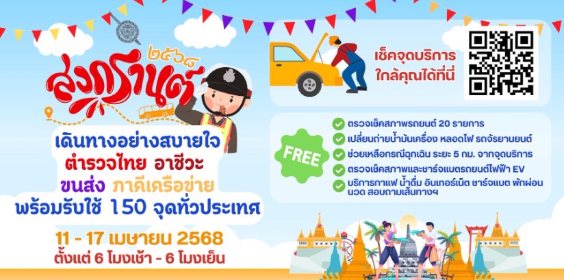 สงกรานต์ 2568 เดินทางอย่างสบายใจ ตำรวจไทย อาชีวะ ขนส่ง ภาคีเครือข่าย พร้อมรับใช้ 150 จุดทั่วประเทศ 11 – 17 เมษายน 2568