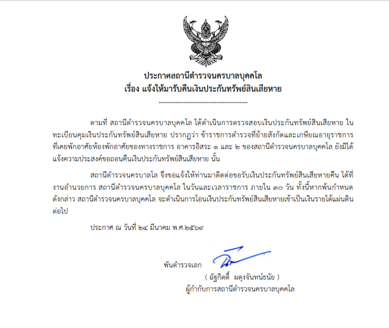 ข่าวประกาศ, ข่าวประชาสัมพันธ์, งานอำนวยการ แจ้งให้มารับคืนเงินประกันทรัพย์สินเสียหาย ตามที่ สถานีตำรวจนครบาลบุคคโล ได้ดำเนิน… bukkalo24 มีนาคม 2026